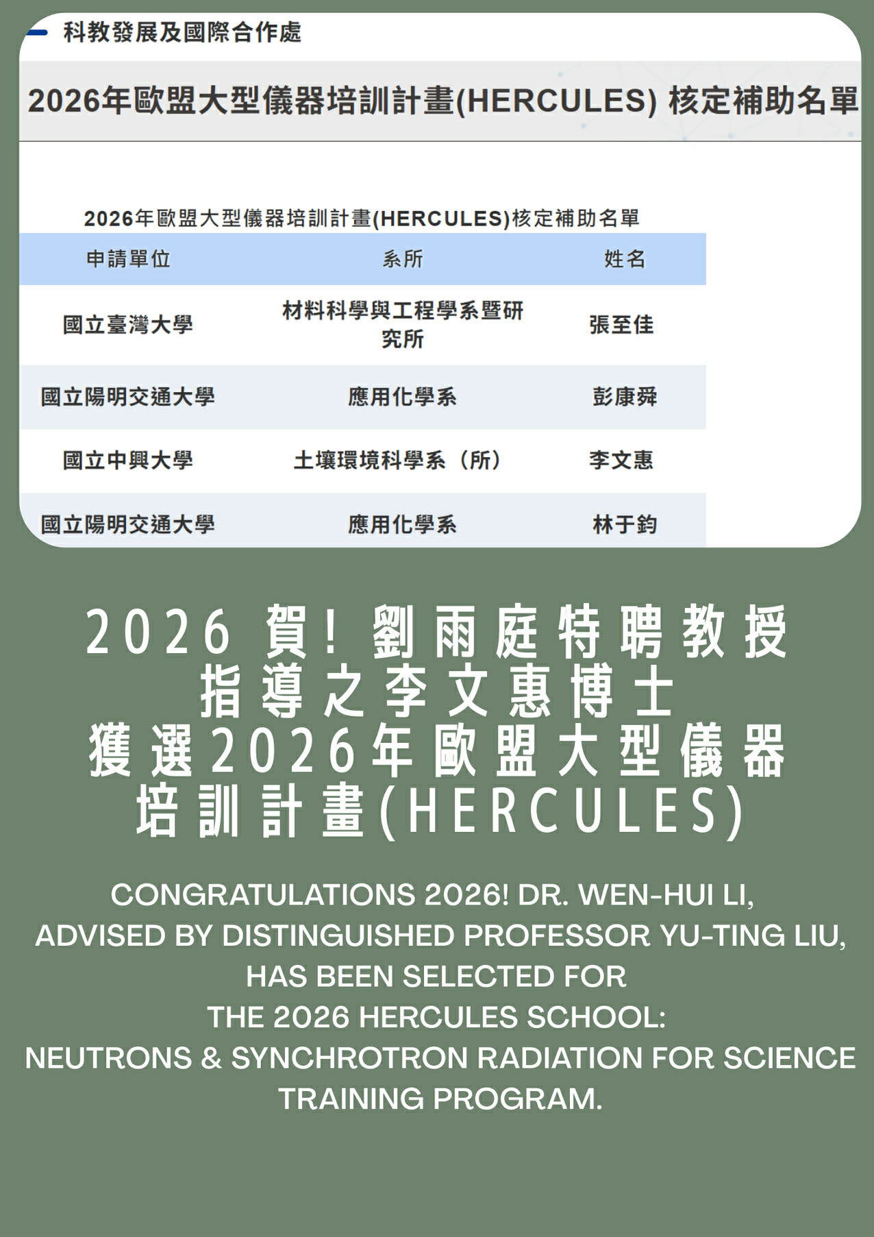 Congratulations 2026! Dr. Wen-Hui Li, advised by Distinguished Professor Yu-Ting Liu, has been selected for the 2026 HERCULES School: Neutrons & Synchrotron Radiation for Science Training Program.